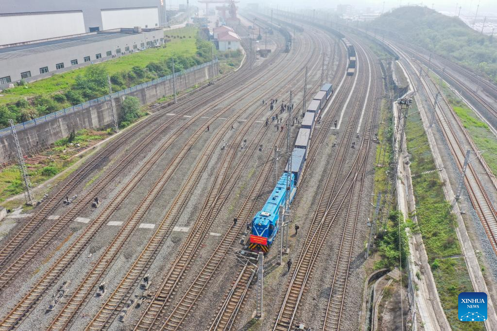 Aerial photo shows the first outbound international rail-sea freight train from China's Yangtze River to Indo-China Peninsula leaving Guoyuan Port in southwest China's Chongqing Municipality for Myanmar's Yangon, April 7, 2022.
