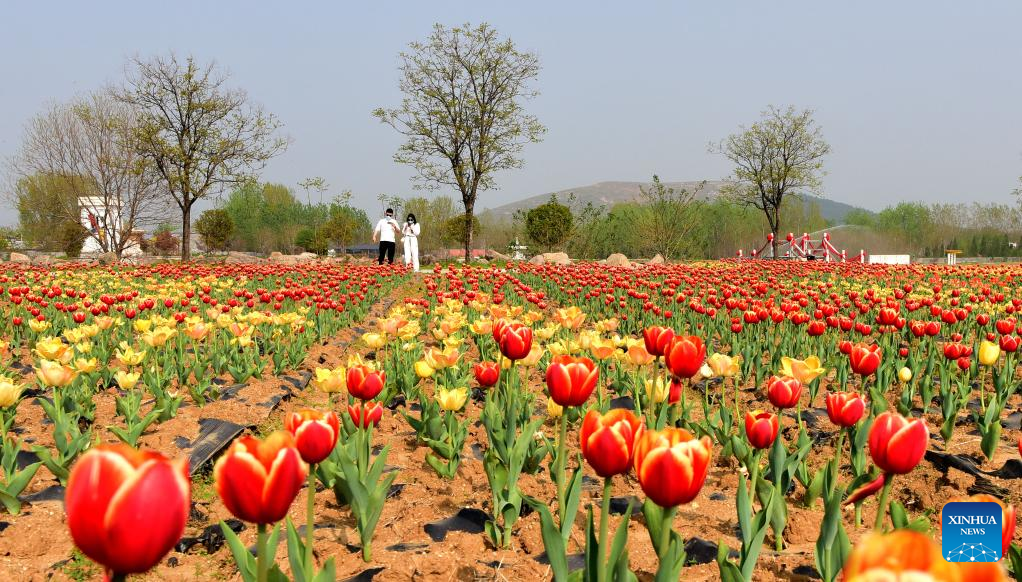 Tourists view tulips at a scenic spot in Suiping County, central China's Henan Procince, April 7, 2022. (Xinhua/Zhu Xiang)