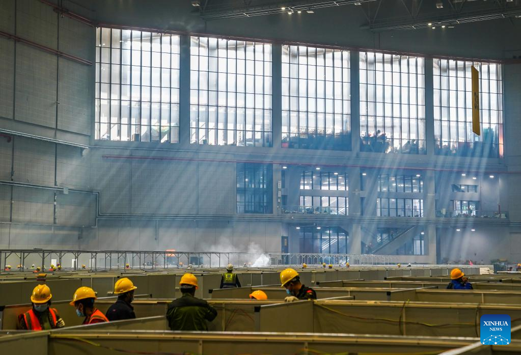People work at the National Exhibition and Convention Center in east China's Shanghai, April 7, 2022. Shanghai is converting the National Exhibition and Convention Center (NECC) into a makeshift hospital with a planned capacity of 40,000 beds. Upon completion, it is expected to act as the biggest such hospital for those testing positive for COVID-19 in the metropolis. (Xinhua/Ding Ting)