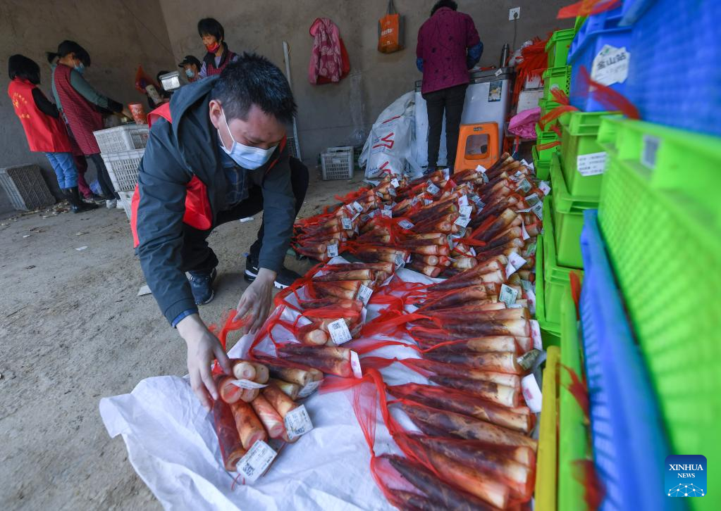Volunteers sort and pack bamboo shoots in Taihuyuan Township of Lin'an District of Hangzhou, east China's Zhejiang Province, April 7, 2022. The township organized volunteers to help daily send about 15,000 kg fresh bamboo shoots to Shanghai, a megacity which is under temporary closed-off management due to COVID-19 resurgence. (Xinhua/Xu Yu)