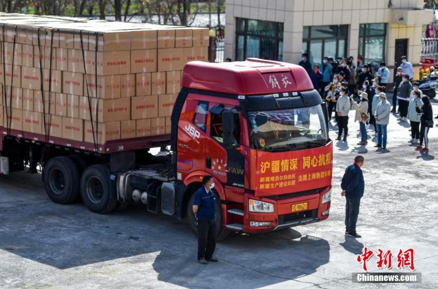 Photo shows the first batch of anti-pandemic supplies, including 16,000 pieces of dried fruit, depart from Urumqi, northwest China's Xinjiang Uyghur Autonomous Region, April 7, 2022. (Photo: China News Service/Liu Xin)