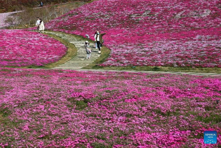 People view flowers in Jinan, east China's Shandong Province, April 8, 2022. (Xinhua/Xu Suhui)