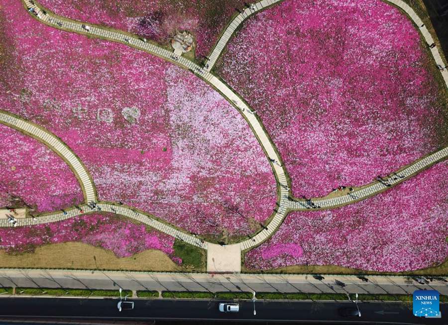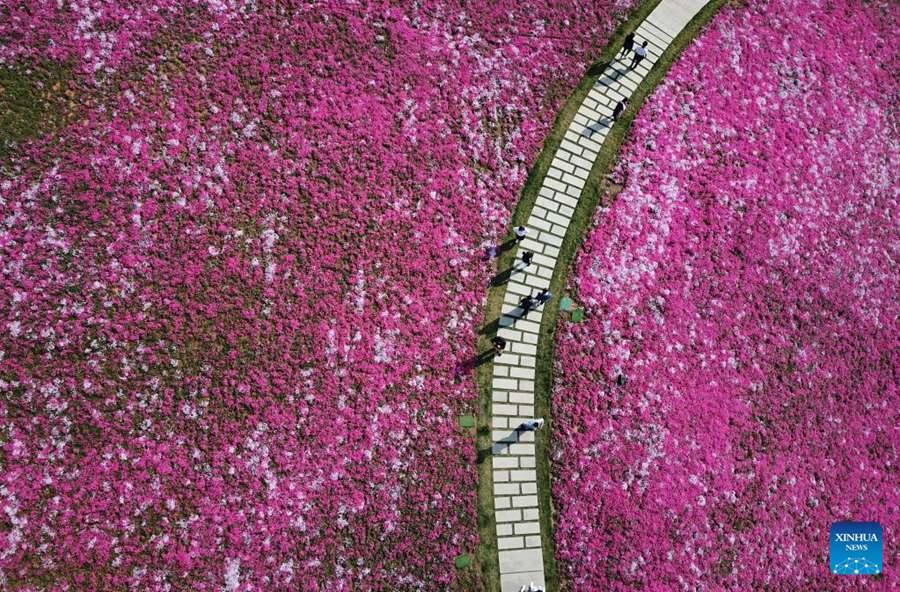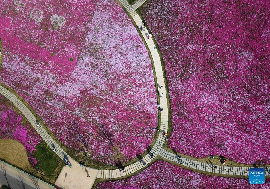 Aerial photo taken on April 8, 2022 shows people viewing flowers in Jinan, east China's Shandong Province. (Xinhua/Xu Suhui)