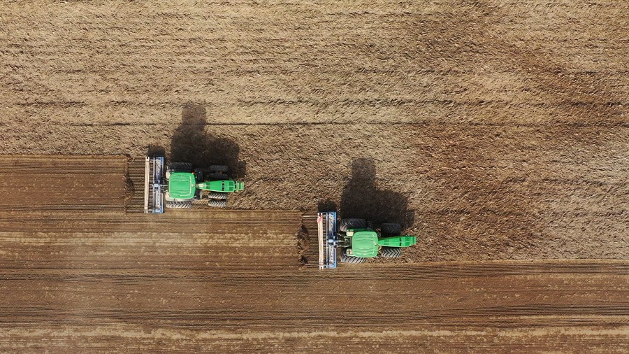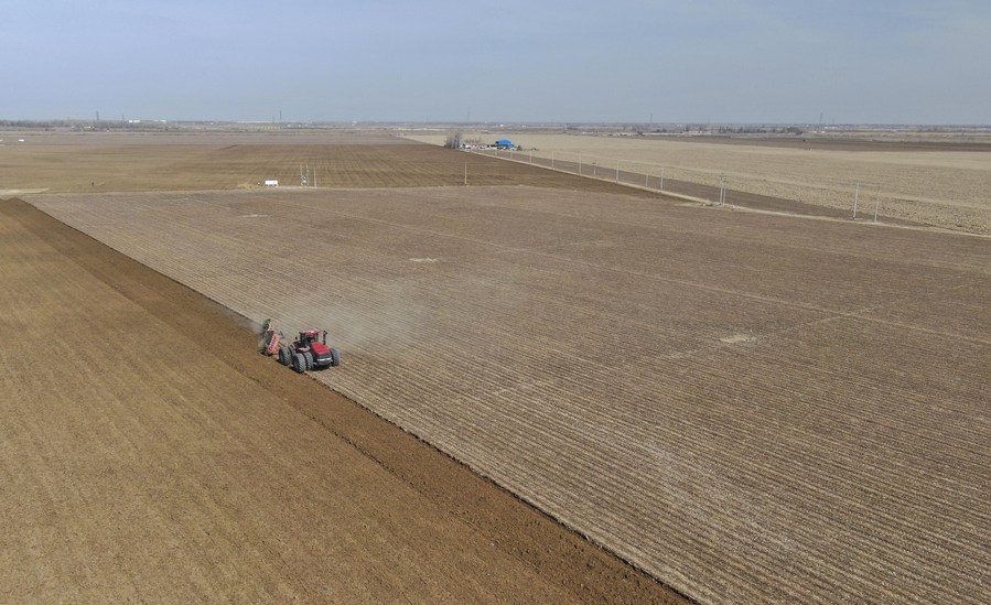 Aerial photo shows a tractor ploughing a cotton field in Shawan City, northwest China's Xinjiang Uygur Autonomous Region, April 2, 2022. (Xinhua/Zhao Ge)