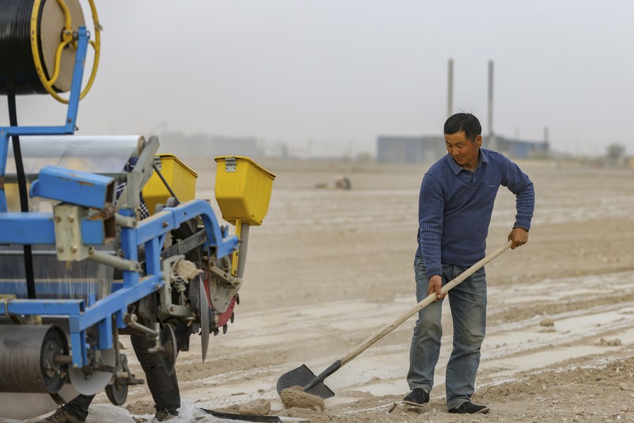 A farmer covers fields with plastic films in Bohu County, northwest China's Xinjiang Uygur Autonomous Region, April 8, 2022. (Photo by Nian Lei/Xinhua)