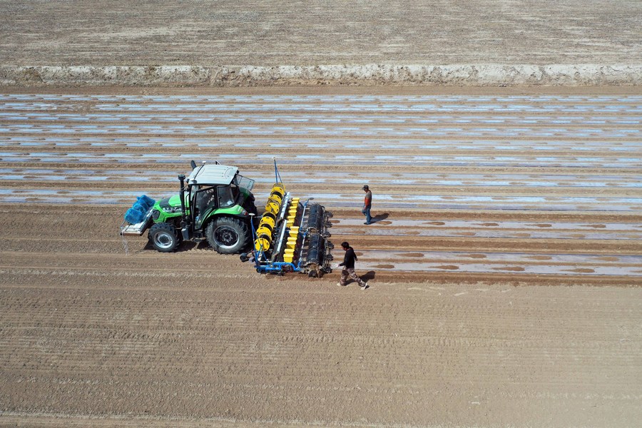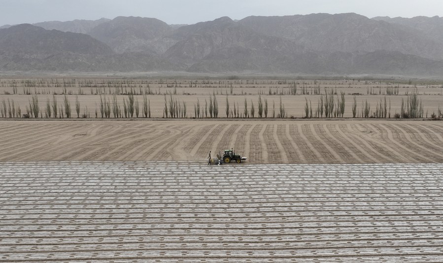 Farmers cover fields with plastic films in Bohu County, northwest China's Xinjiang Uygur Autonomous Region, April 8, 2022. (Photo by Nian Lei/Xinhua)
