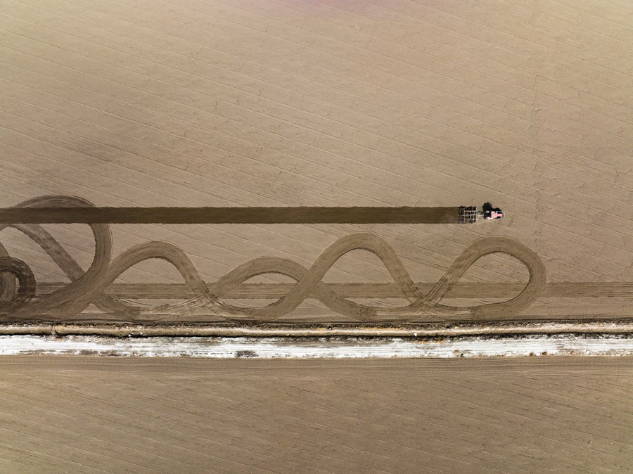 Aerial photo shows a tractor ploughing a cotton field in Korla City, northwest China's Xinjiang Uygur Autonomous Region, April 3, 2022. (Photo by Huang Wanli/Xinhua)
