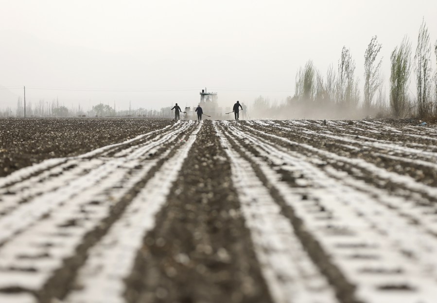 URUMQI, April 9, 2022 (Xinhua) -- Spring farming of cotton has started in Xinjiang.