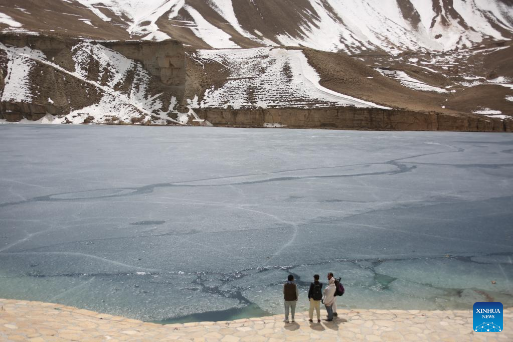 Tourists stand by Band-e-Amir Lake in Bamiyan province, Afghanistan, on March 18, 2022. The picturesque Band-e-Amir was a popular tourist destination in the past but the U.S. sanctions on Afghanistan have ruined people's joy here. (Photo by Saifurahman Safi/Xinhua)