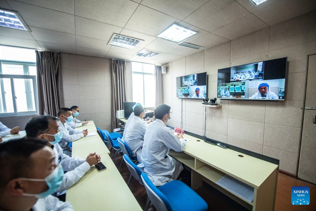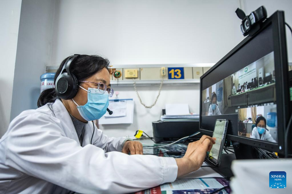An expert from Guizhou Provincial People's Hospital has a remote tele-consultation with doctors from the First People's Hospital of Bijie City in southwest China's Guizhou Province, March 30, 2022. Guizhou Province has realized a remote medical service system covering various levels of public hospitals to alleviate problems including poor accessibility and affordability of health care services for people. (Xinhua/Tao Liang)