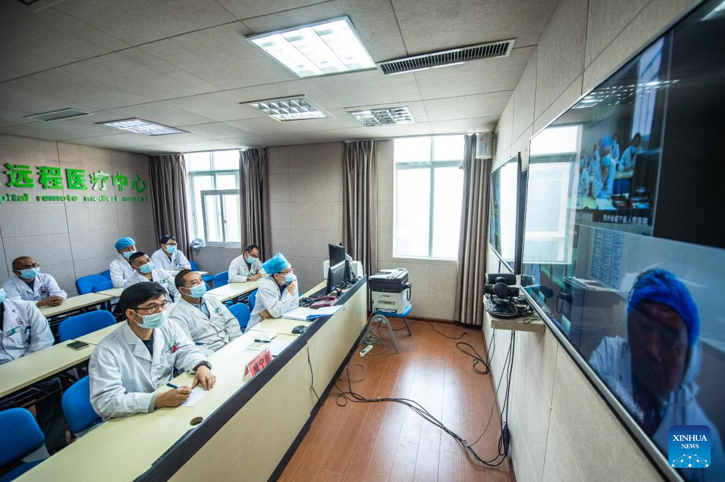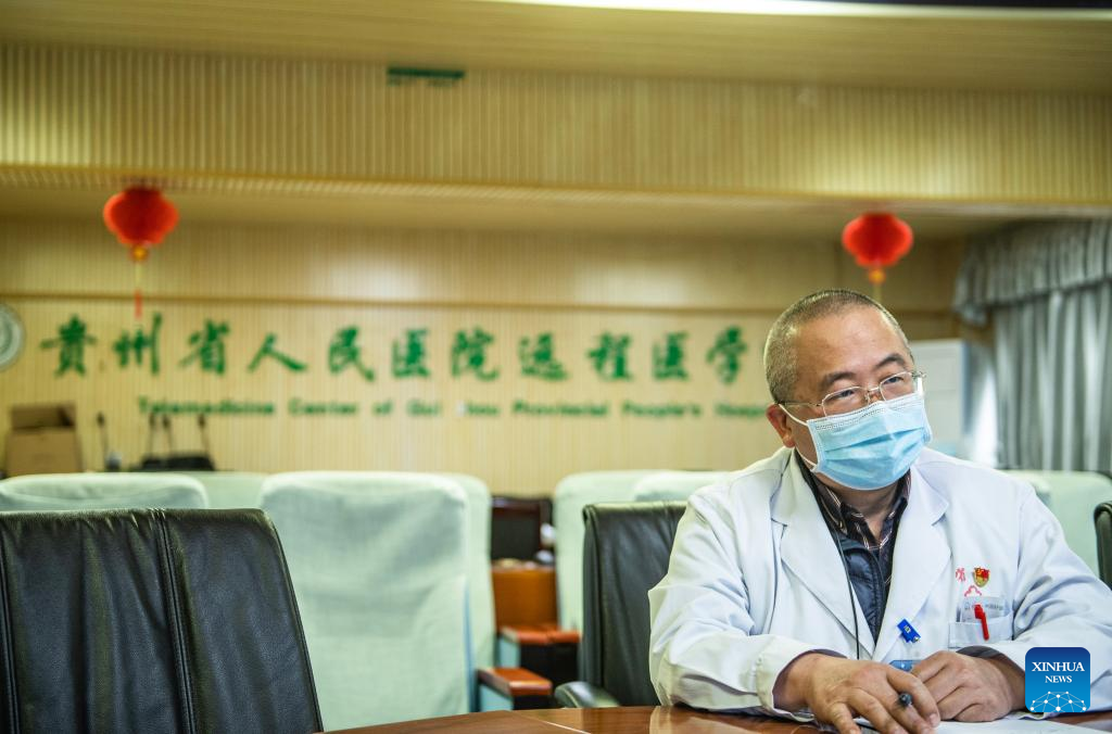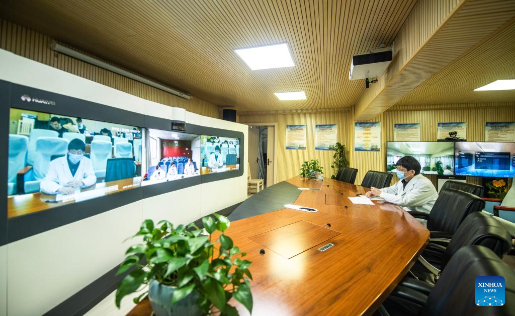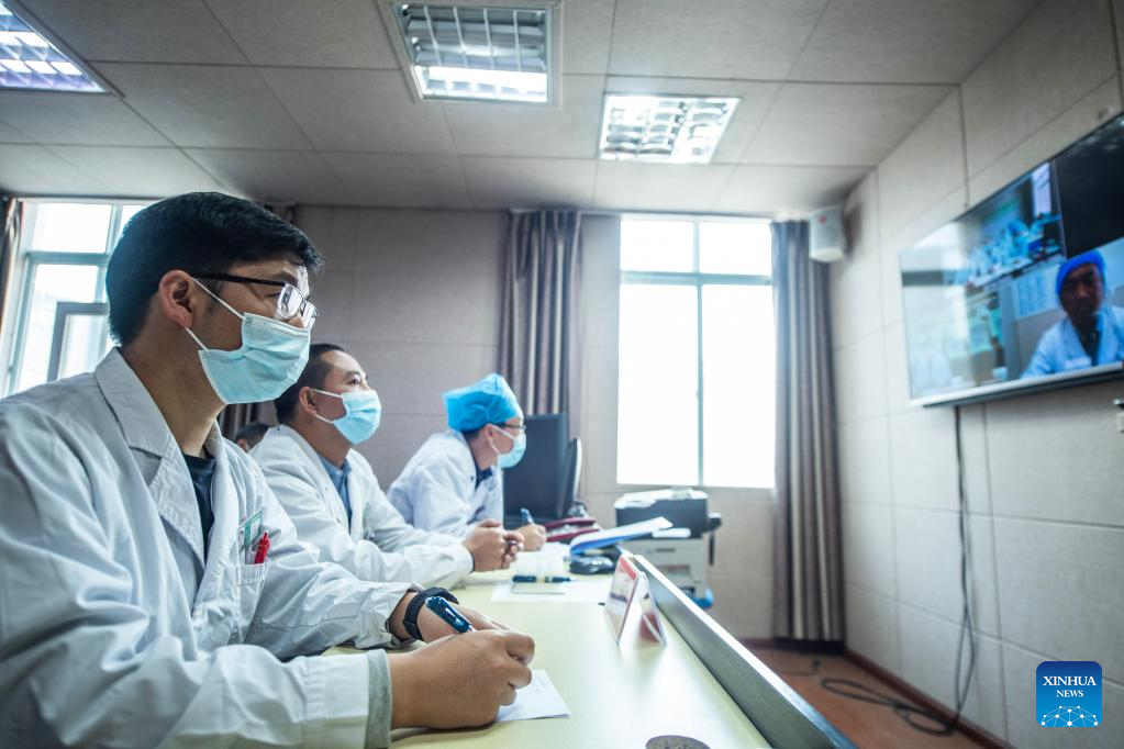 A doctor from Guizhou Provincial People's Hospital has a remote tele-consultation with doctors from Chishui People's Hospital in southwest China's Guizhou Province, March 30, 2022. Guizhou Province has realized a remote medical service system covering various levels of public hospitals to alleviate problems including poor accessibility and affordability of health care services for people. (Xinhua/Tao Liang)