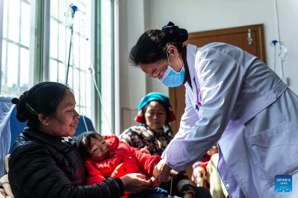 A medical worker treats a child at a health center in Langdai Township of Liupanshui City, southwest China's Guizhou Province, Feb. 28, 2019. Guizhou Province has realized a remote medical service system covering various levels of public hospitals to alleviate problems including poor accessibility and affordability of health care services for people. (Xinhua/Tao Liang)
