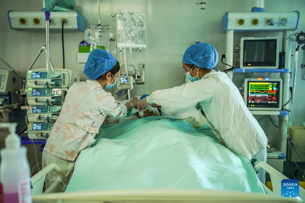 Nurses attend to a patient diagnosed by experts from Guizhou Provincial People's Hospital through remote tele-consultation in Weining People's Hospital in Weining Yi, Hui and Miao Autonomous County, southwest China's Guizhou Province, March 29, 2022. Guizhou Province has realized a remote medical service system covering various levels of public hospitals to alleviate problems including poor accessibility and affordability of health care services for people. (Xinhua/Tao Liang)