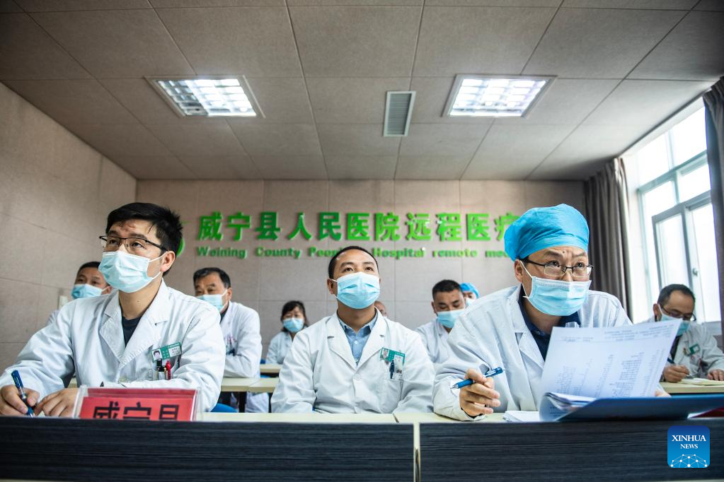 Doctors from Weining People's Hospital have a remote tele-consultation with experts from Guizhou Provincial People's Hospital in Weining Yi, Hui and Miao Autonomous County, southwest China's Guizhou Province, March 29, 2022. Guizhou Province has realized a remote medical service system covering various levels of public hospitals to alleviate problems including poor accessibility and affordability of health care services for people. (Xinhua/Tao Liang)