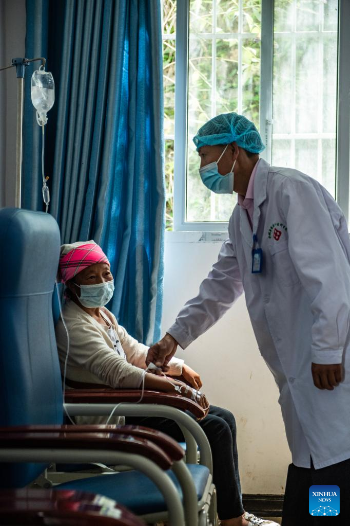 Doctor Zhang Zhongwu (R) gives an infusion to a patient at a medical room in Yangchang Village of Zhongshan District in Liupanshui, southwest China's Guizhou Province, Aug. 16, 2021. Guizhou Province has realized a remote medical service system covering various levels of public hospitals to alleviate problems including poor accessibility and affordability of health care services for people. (Xinhua/Tao Liang)