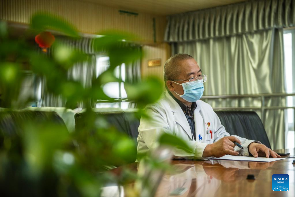 A doctor from Guizhou Provincial People's Hospital has a remote tele-consultation with doctors from Rongjiang Chinese Medicine Hospital in southwest China's Guizhou Province, March 30, 2022. Guizhou Province has realized a remote medical service system covering various levels of public hospitals to alleviate problems including poor accessibility and affordability of health care services for people. (Xinhua/Tao Liang)