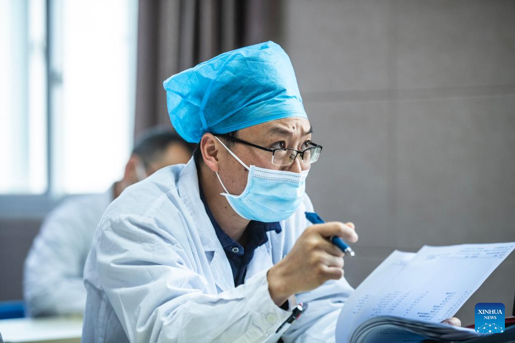 Doctors from Weining People's Hospital have a remote tele-consultation with experts from Guizhou Provincial People's Hospital in southwest China's Guizhou Province, March 29, 2022. Guizhou Province has realized a remote medical service system covering various levels of public hospitals to alleviate problems including poor accessibility and affordability of health care services for people. (Xinhua/Tao Liang)