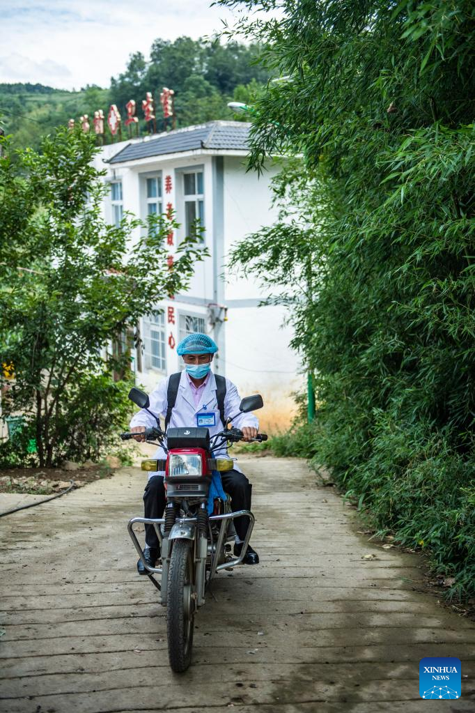 A doctor leaves a medical center to visit patients in Yangchang Village of Zhongshan District in Liupanshui, southwest China's Guizhou Province, Aug. 16, 2021. Guizhou Province has realized a remote medical service system covering various levels of public hospitals to alleviate problems including poor accessibility and affordability of health care services for people. (Xinhua/Tao Liang)