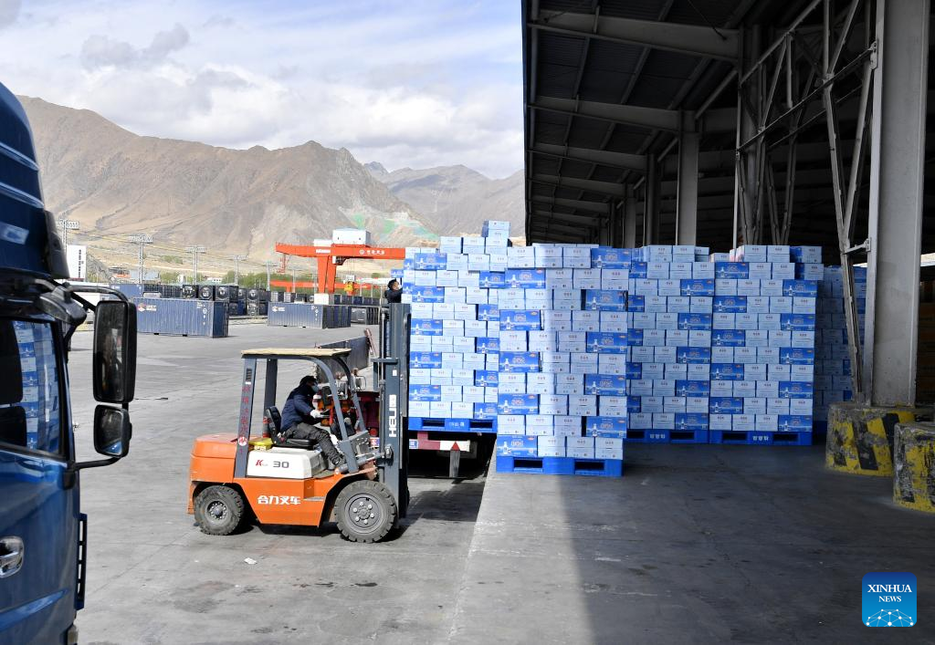 A staff member transports drinking water at a freight station in Lhasa, southwest China's Tibet Autonomous Region, April 10, 2022. Tibet sends living materials including drinking water and yak meat to east China's Shanghai and drinking water to northeast China's Jilin Province Sunday, to help the fight against the recent resurgence of COVID-19 pandemic in these areas. (Xinhua/Zhang Rufeng)