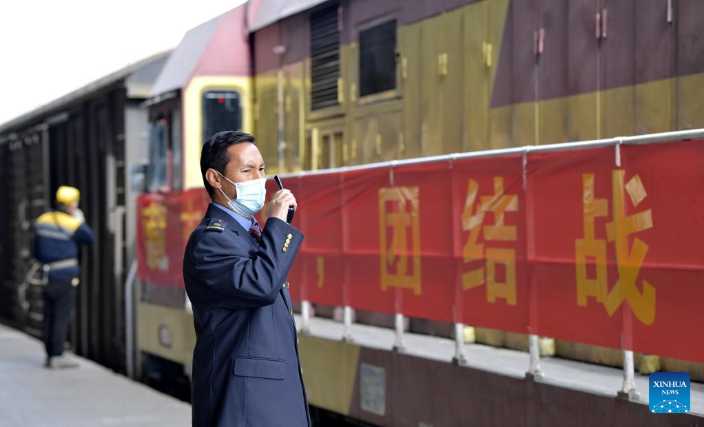 A staff member coordinates with his colleague about the departure of a freight train at a freight station in Lhasa, southwest China's Tibet Autonomous Region, April 10, 2022. Tibet sends living materials including drinking water and yak meat to east China's Shanghai and drinking water to northeast China's Jilin Province Sunday, to help the fight against the recent resurgence of COVID-19 pandemic in these areas. (Xinhua/Zhang Rufeng)