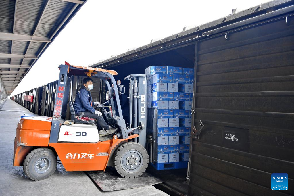 A staff member transports drinking water onto a freight train in Lhasa, southwest China's Tibet Autonomous Region, April 10, 2022. Tibet sends living materials including drinking water and yak meat to east China's Shanghai and drinking water to northeast China's Jilin Province Sunday, to help the fight against the recent resurgence of COVID-19 pandemic in these areas. (Xinhua/Zhang Rufeng)