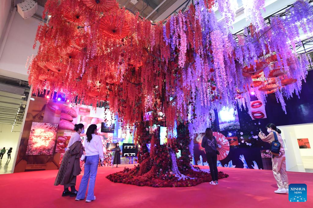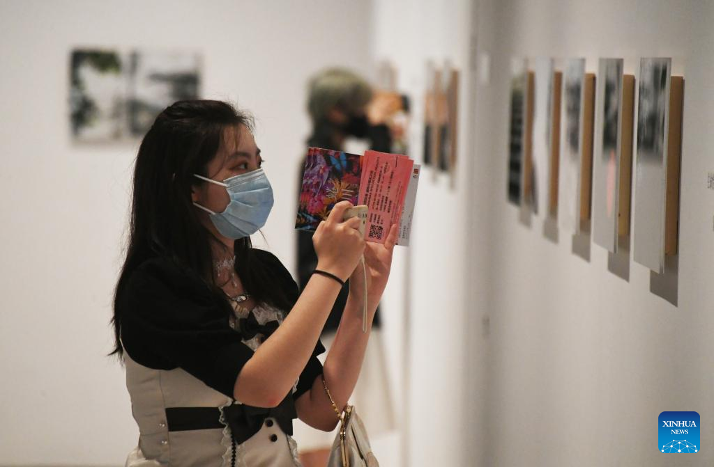 A woman takes pictures at the Times Art Museum in Beijing, capital of China, April 10, 2022. (Xinhua/Ren Chao)