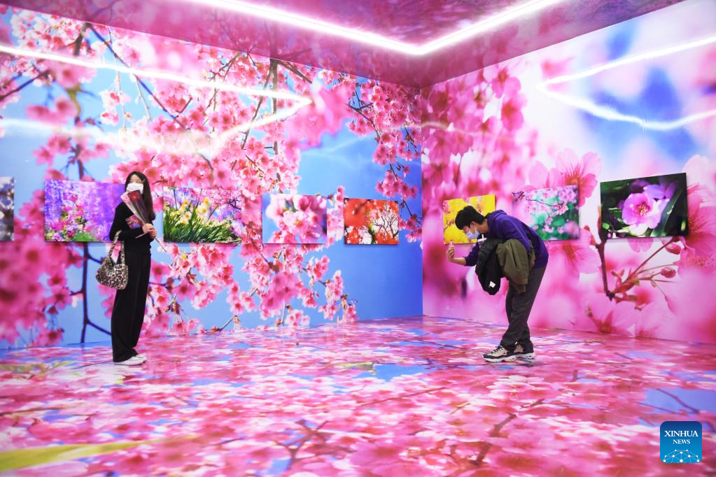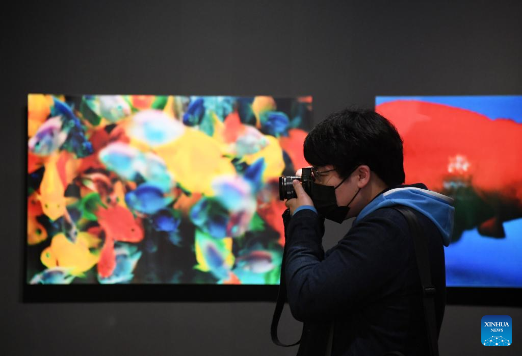 A man takes pictures at the Times Art Museum in Beijing, capital of China, April 10, 2022. (Xinhua/Ren Chao)