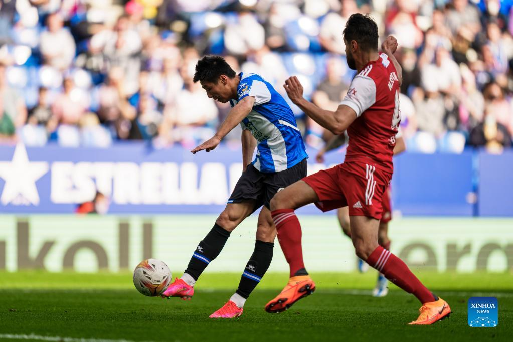 Espanyol's Wu Lei (L) competes during a La Liga match between RCD Espanyol and RC Celta in Cornella, Spain, April 10, 2022. (Photo by Joan Gosa/Xinhua)