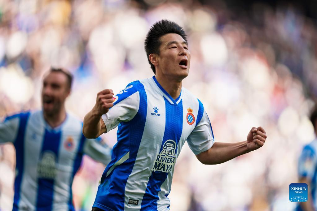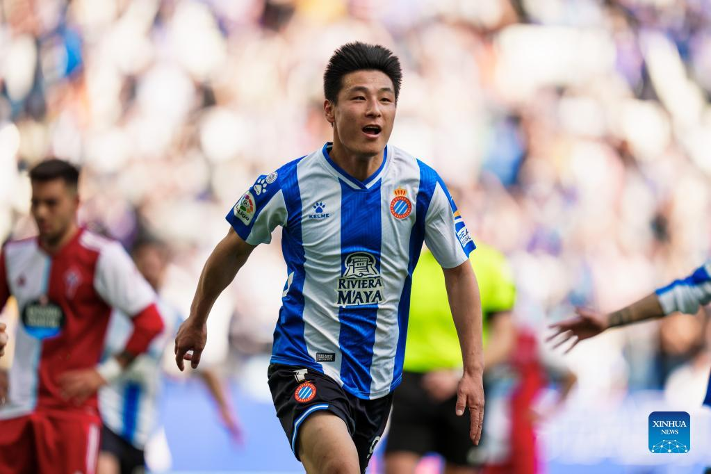 Espanyol's Wu Lei celebrates his goal during a La Liga match between RCD Espanyol and RC Celta in Cornella, Spain, April 10, 2022. (Photo by Joan Gosa/Xinhua)