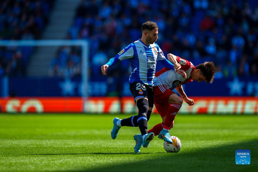 Espanyol's Adrian Embarba (L) vies with Celta's Franco Cervi during a La Liga match between RCD Espanyol and RC Celta in Cornella, Spain, April 10, 2022. (Photo by Joan Gosa/Xinhua)
