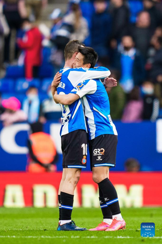 Espanyol's Wu Lei (R) celebrates victory with Sergi Darder after a La Liga match between RCD Espanyol and RC Celta in Cornella, Spain, April 10, 2022. (Photo by Joan Gosa/Xinhua)