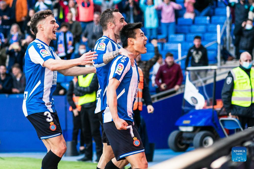 Espanyol's Wu Lei (R) celebrates his goal with teammates during a La Liga match between RCD Espanyol and RC Celta in Cornella, Spain, April 10, 2022. (Photo by Joan Gosa/Xinhua)