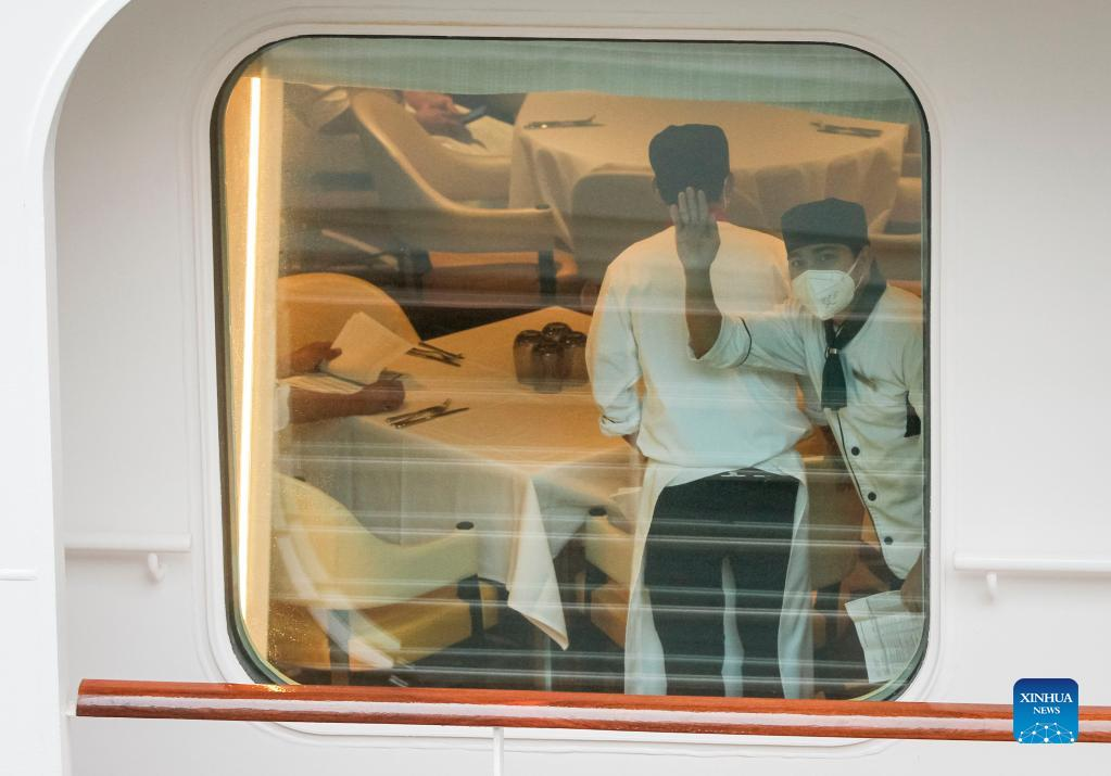 A crew member of the Holland America Koningsdam cruise ship waves from the window after the ship docked at the Canada Place cruise terminal in Vancouver, British Columbia, Canada, on April 10, 2022. The Holland America Koningsdam on Sunday became the first cruise ship to call at the port of Vancouver in about two and half years since the onset of the coronavirus pandemic. About 310 cruise ship calls are expected for the 2022 season, according to Vancouver Fraser Port Authority. (Photo by Liang Sen/Xinhua)