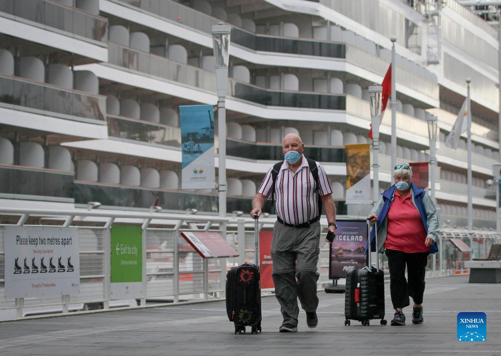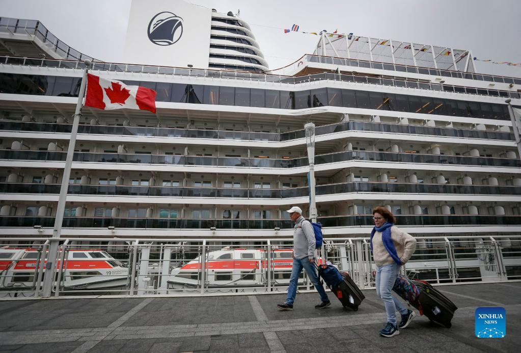 Passengers disembark from the Holland America Koningsdam cruise ship after the ship docked at the Canada Place cruise terminal in Vancouver, British Columbia, Canada, on April 10, 2022. The Holland America Koningsdam on Sunday became the first cruise ship to call at the port of Vancouver in about two and half years since the onset of the coronavirus pandemic. About 310 cruise ship calls are expected for the 2022 season, according to Vancouver Fraser Port Authority. (Photo by Liang Sen/Xinhua)