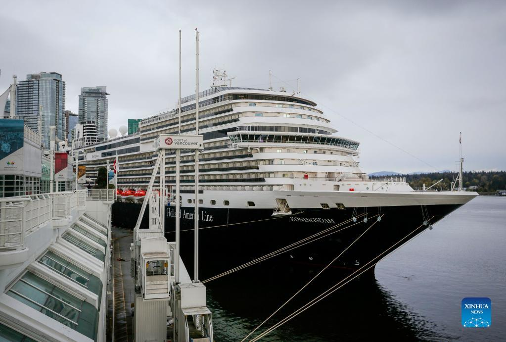The Holland America Koningsdam cruise ship is berthed at the Canada Place cruise terminal in Vancouver, British Columbia, Canada, on April 10, 2022. The Holland America Koningsdam on Sunday became the first cruise ship to call at the port of Vancouver in about two and half years since the onset of the coronavirus pandemic. About 310 cruise ship calls are expected for the 2022 season, according to Vancouver Fraser Port Authority. (Photo by Liang Sen/Xinhua)