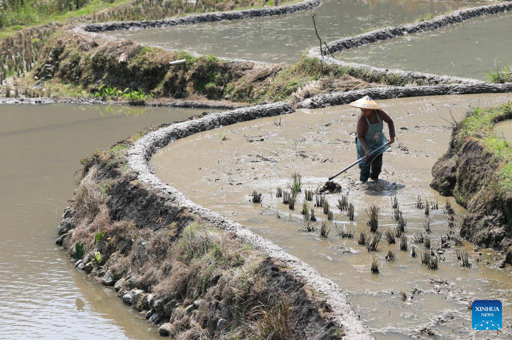 A farmer works in a field in Gangbian Village of Congjiang County, Qiandongnan Miao and Dong Autonomous Prefecture, southwest China’s Guizhou Province, April 10, 2022. (Xinhua/Luo Jinglai)