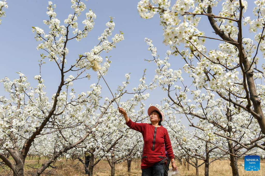 A farmer pollinates pear flowers in a pear orchard in Xiangyuan Village of Pingyao County, Jinzhong City, north China’s Shanxi Province, April 10, 2022. (Xinhua/Liang Shengren)