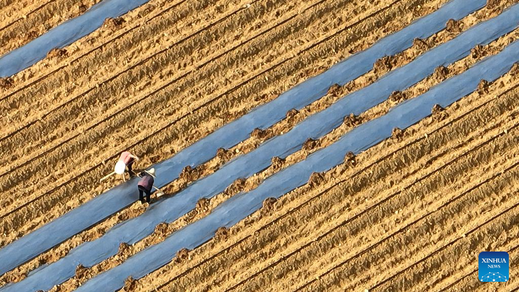 A farmer manages potato seedlings sown in a field in Sangcun Town of Shanting District, Zaozhuang City, east China’s Shandong Province, April 10, 2022. (Xinhua/Li Zongxian)