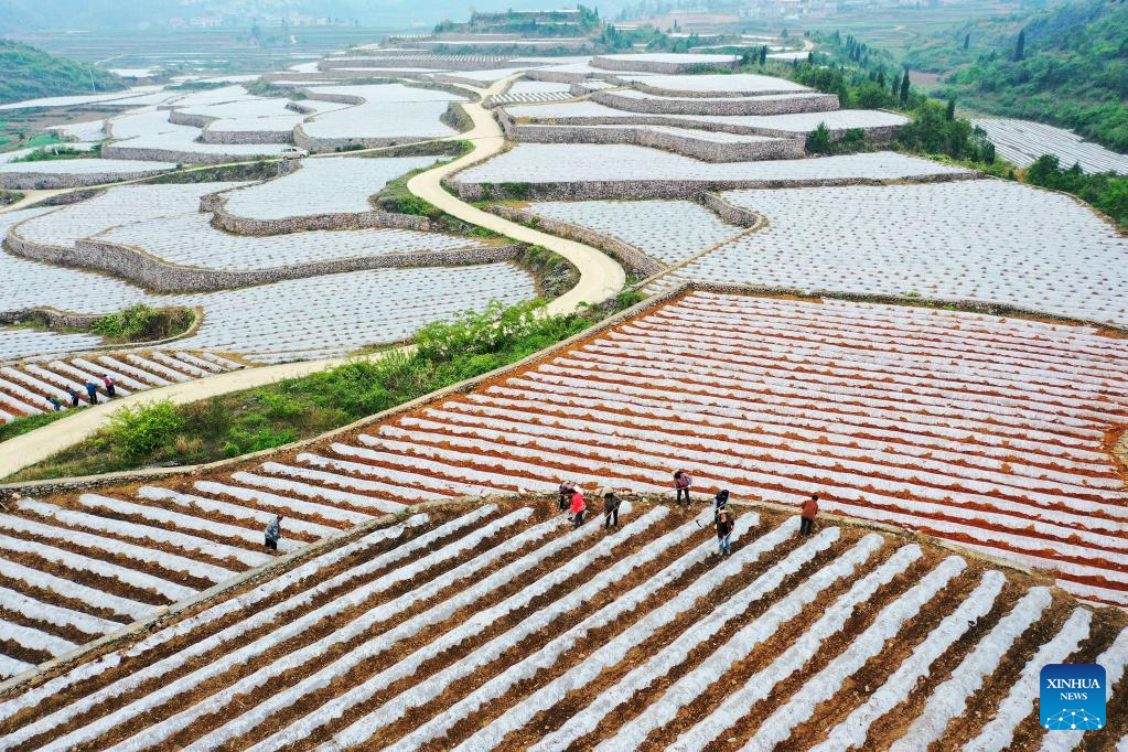 Aerial photo taken on April 10, 2022 shows farmers working in a field in Luoao Village of Luping Town, Fuquan City, Qiannan Buyi and Miao Autonomous Prefecture, southwest China’s Guizhou Province. (Xinhua/Yi Shengwu)