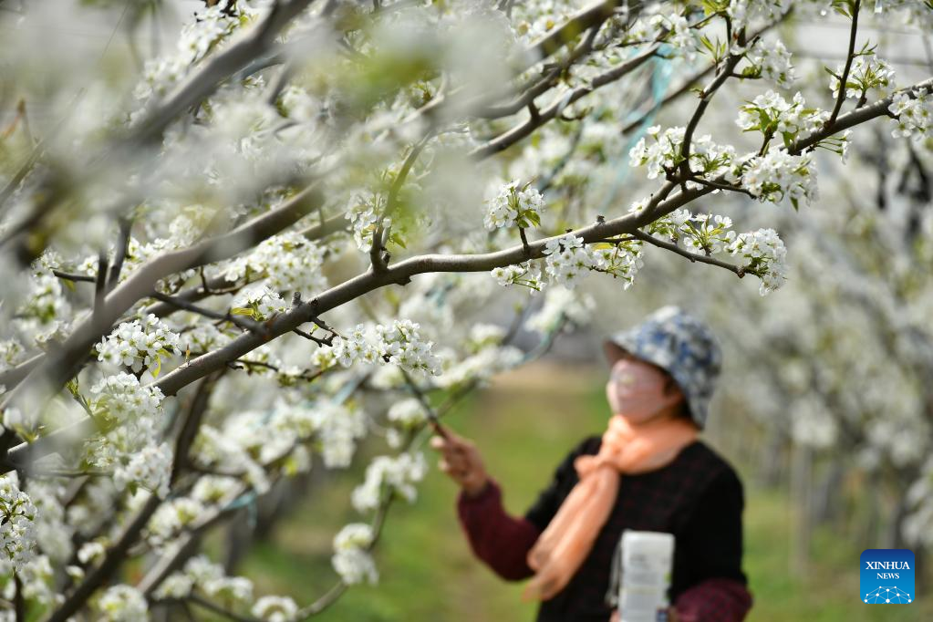 A farmer pollinates pear flowers in a pear orchard in Hougaoyao Village of Waliwang Town, Cangzhou City, north China’s Hebei Province, April 10, 2022. (Xinhua/Yuan Liwei)