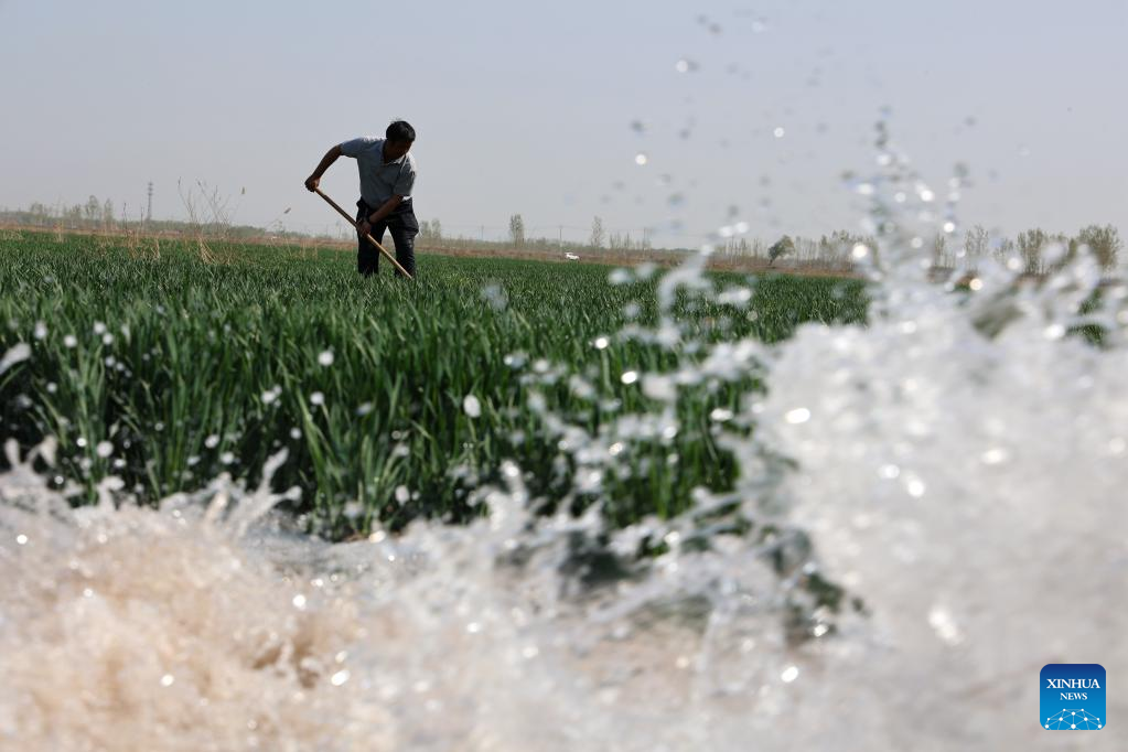 A farmer irrigates wheat in Gaomiaoli Village of Boxing County, Binzhou City, east China’s Shandong Province, April 10, 2022. (Xinhua/Chu Baorui)