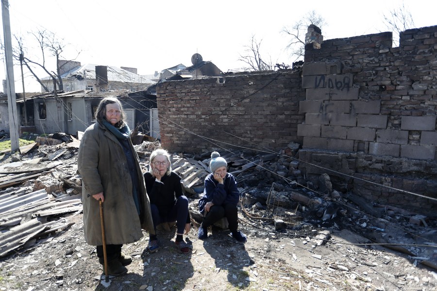 Local residents are seen outside the damaged buildings in Mariupol, April 7, 2022. (Photo by Victor/Xinhua)