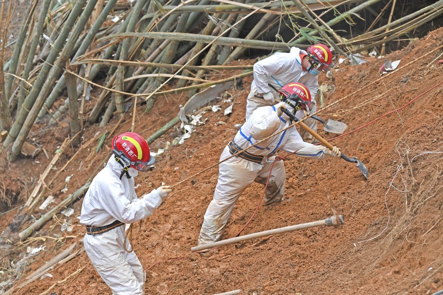 Rescuers secured by safety ropes conduct search and rescue work at the plane crash site in Tengxian County, South China's Guangxi Zhuang autonomous region, March 25, 2022. [Photo/Xinhua]