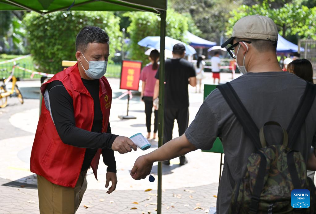 At a nucleic acid testing site in Haikou on Sunday, Tommy from America checked people's temperatures and made sure that they maintained the proper distance.