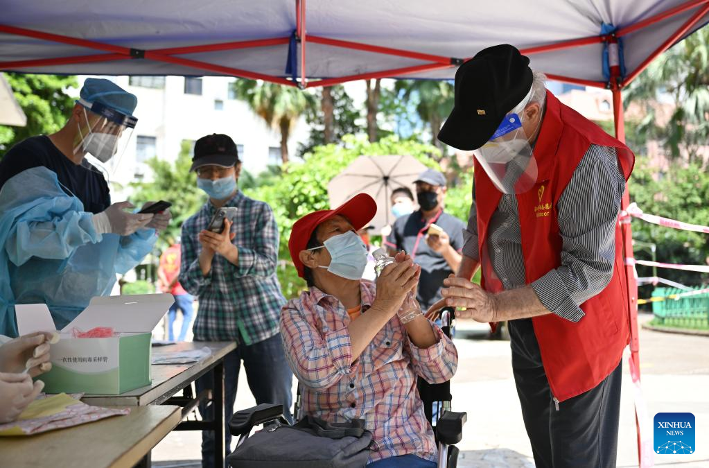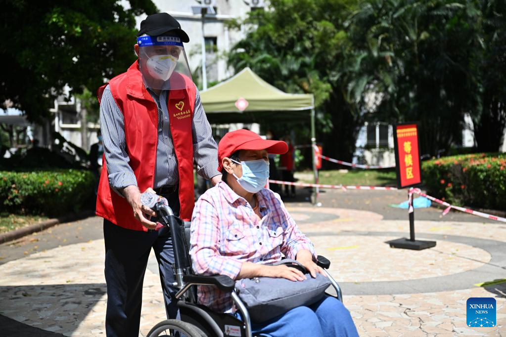 Farr, a volunteer from New Zealand, helps a resident in wheelchair take the nucleic acid test in Haikou, capital of south China's Hainan Province, April 10, 2022.