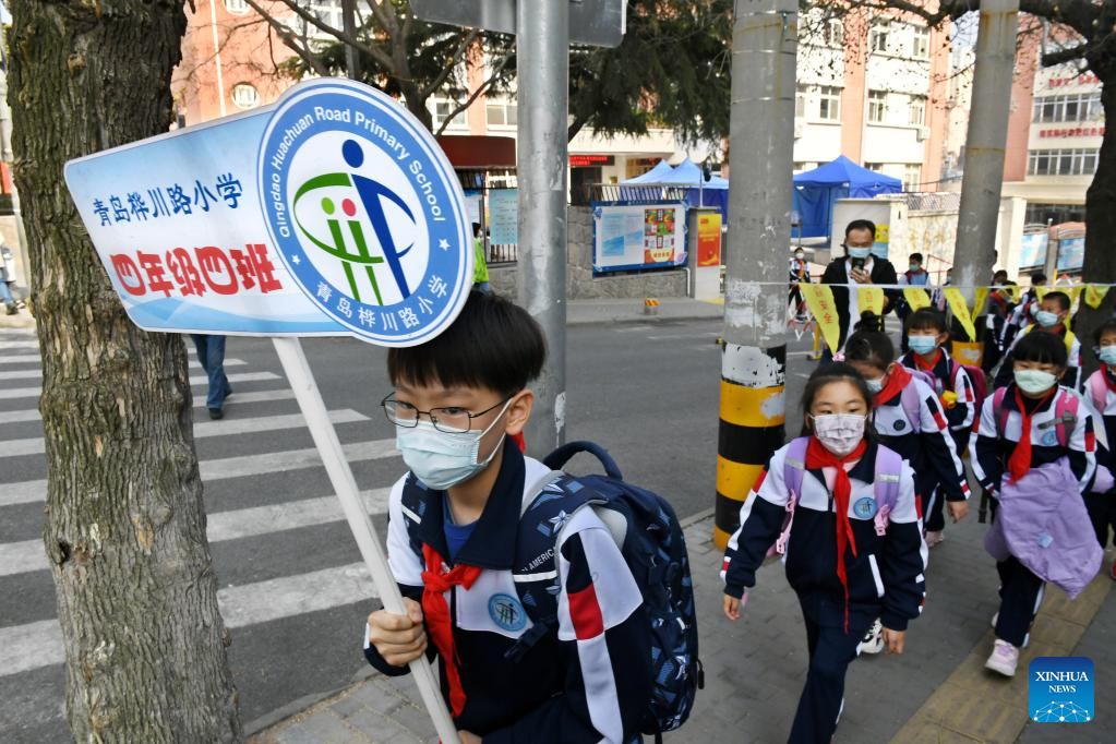 Students are seen after school at Qingdao Huachuan Road Primary School in Qingdao, east China's Shandong Province, April 11, 2022. Primary and middle schools in Qingdao resumed classes on Monday. (Xinhua/Li Ziheng)