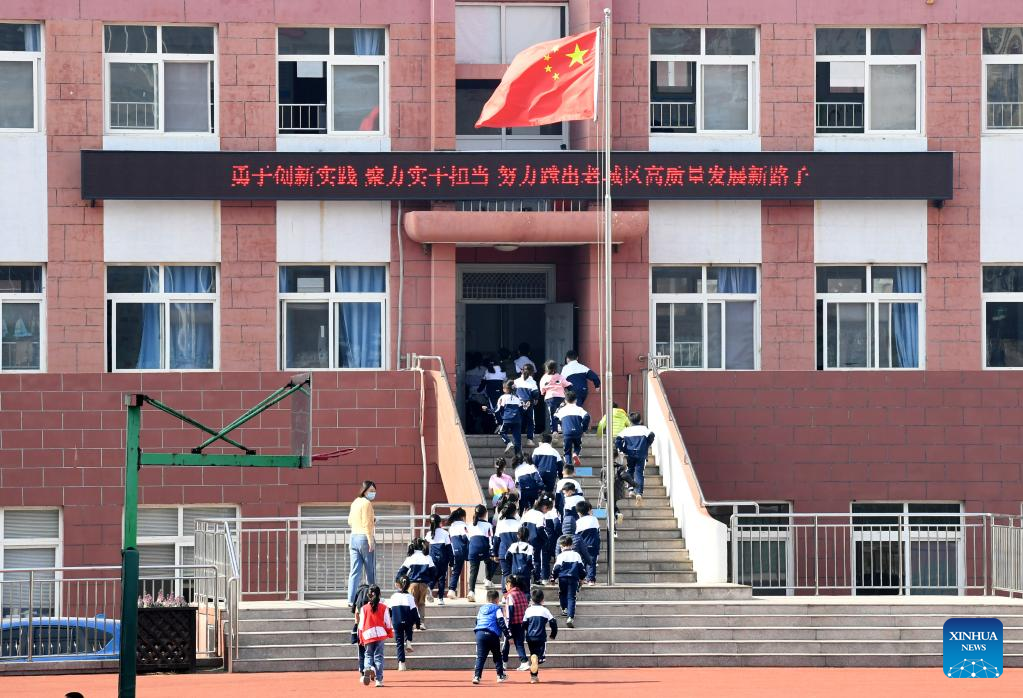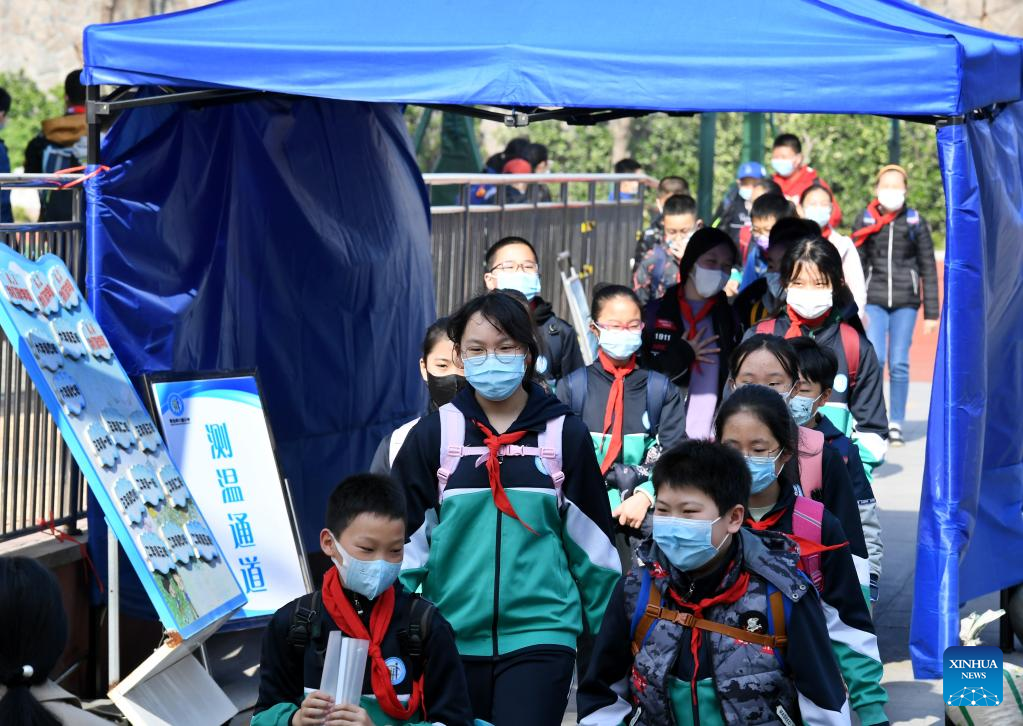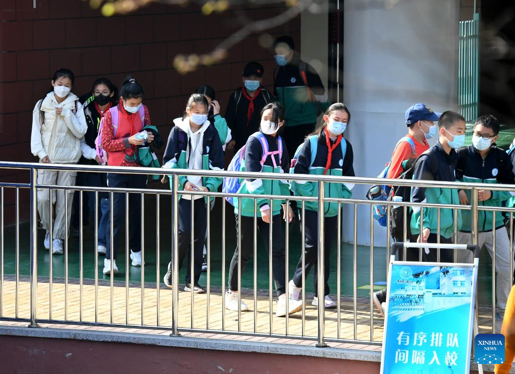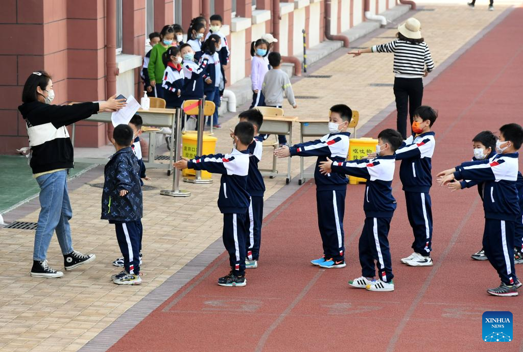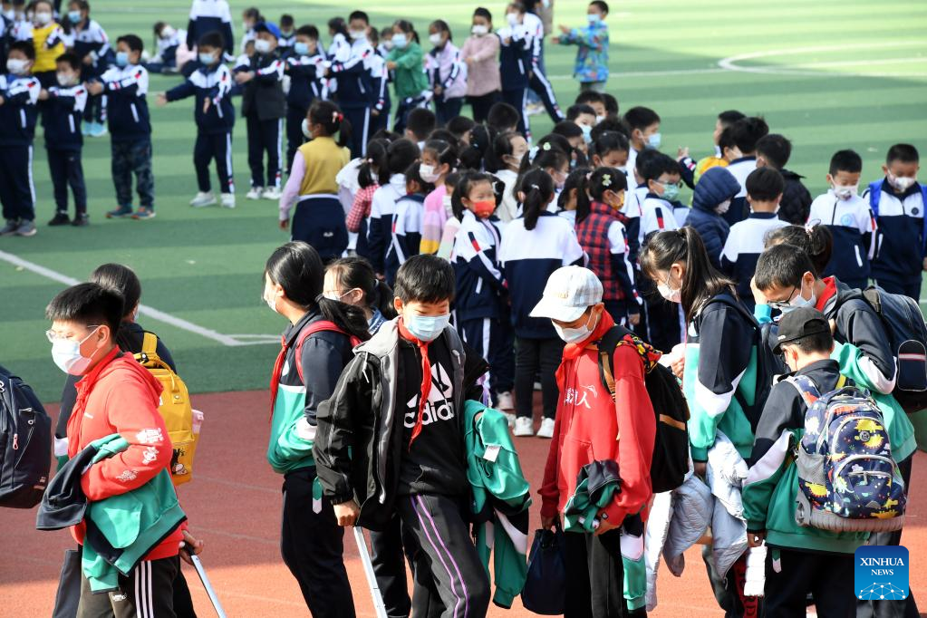 Students prepare to leave school at Qingdao Huachuan Road Primary School in Qingdao, east China's Shandong Province, April 11, 2022. Primary and middle schools in Qingdao resumed classes on Monday. (Xinhua/Li Ziheng)