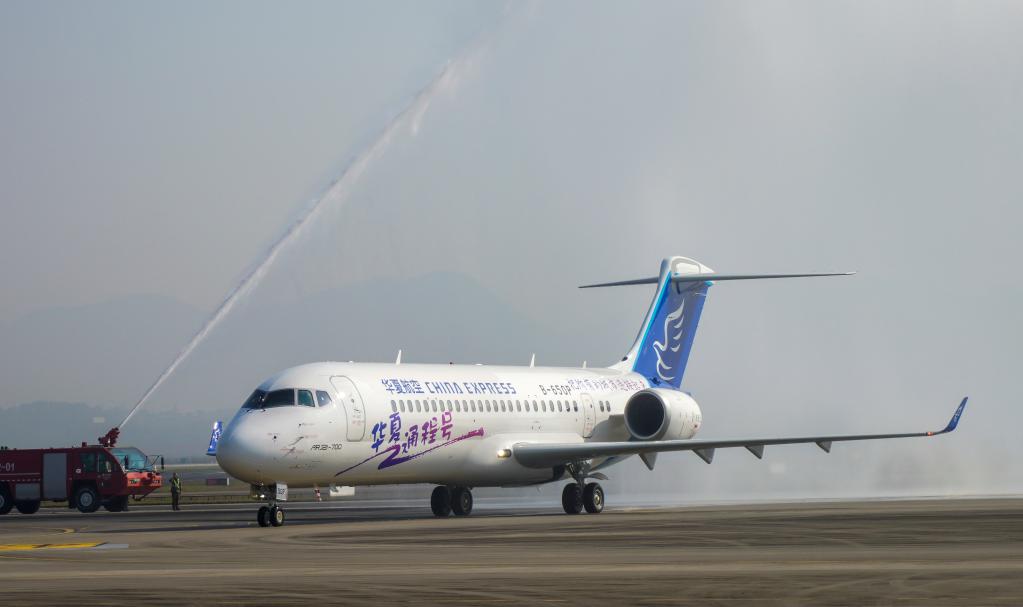 An ARJ21 jetliner passes a water gate at the Chongqing Jiangbei International Airport in Chongqing, southwest China, Nov. 10, 2020. (Xinhua/Liu Chan)
