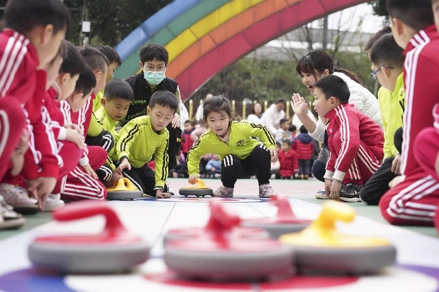 Children play floor curling under the instruction of teachers at a kindergarten in Beibei district, southwest China's Chongqing municipality, Feb. 16, 2022. (People's Daily Online/Qin Tingfu)