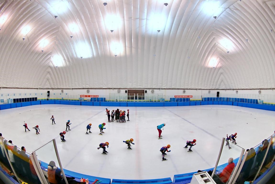 Athletes join a training session in a skating stadium in Haigang district, Qinhuangdao, north China's Hebei province, Feb. 16, 2022. (People's Daily Online/Cao Jianxiong)